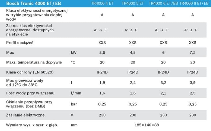 Bosch Tronic 4000 6 ET charakteryzuje się łatwością montażu i możliwością łączenia z ogólnodostępną armaturą. Może być używany zarówno w układach zamkniętych, jak i otwartych, co czyni go wszechstronnym rozwiązaniem dla różnych instalacji hydraulicznych. Dodatkowo, model ten można podłączyć do standardowego gniazdka w obwodzie zabezpieczonym bezpiecznikiem 16 A, co ułatwia instalację i użytkowanie.