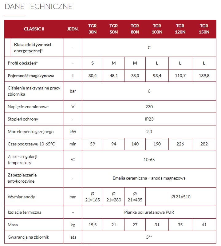 Podgrzewacze serii Classic II są urządzeniami ciśnieniowymi, pionowymi, dostarczającymi podgrzaną wodę do kilku punktów poboru. Zbiornik stalowy zabezpieczony jest przed korozją emalią ceramiczną oraz anodą magnezową. Izolację wykonano z bezfreonowej pianki poliuretanowej. Szeroka gama pojemności: 30, 50, 80, 100, 120, 150 litrów, pozwala na optymalny dobór konkretnego urządzenia w zależności od zapotrzebowania na c.w.u. Wszystkie modele podgrzewaczy posiadają grzałki elektryczne o mocy 2,0 kW. Są standardowo wyposażone w zawór bezpieczeństwa oraz wskaźnik temperatury.