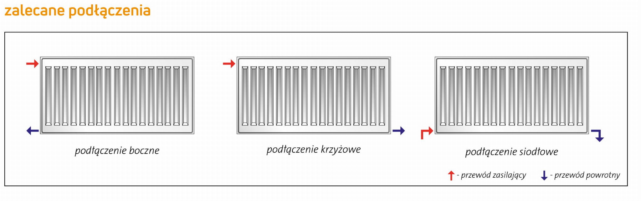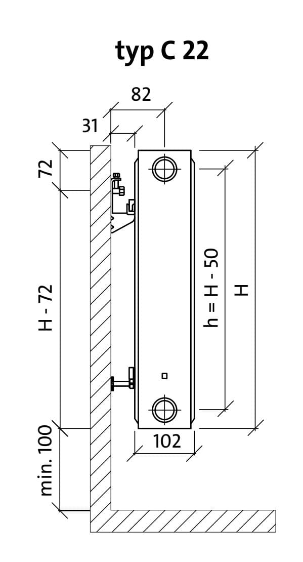Grzejniki typu C wyposażone są w cztery boczne otwory przyłączeniowe z gwintem wewnętrznym ½″.