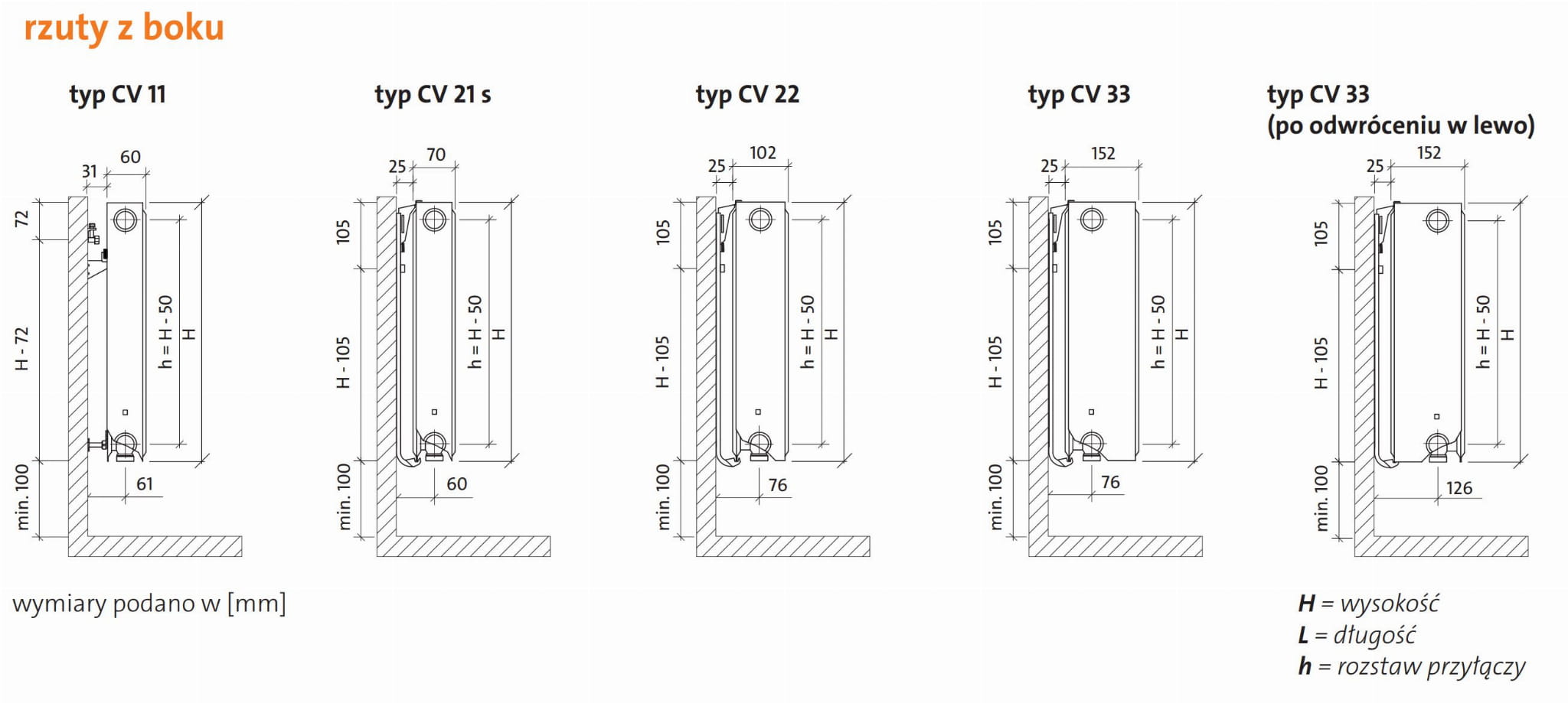 Grzejniki typu C wyposażone są w cztery boczne otwory przyłączeniowe z gwintem wewnętrznym ½″.