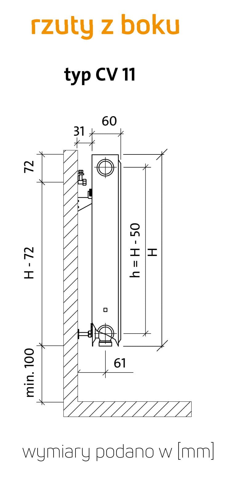 Grzejniki typu CV wyposażone są w cztery boczne i dwa dolne otwory przyłączeniowe z gwintem wewnętrznym ½″.