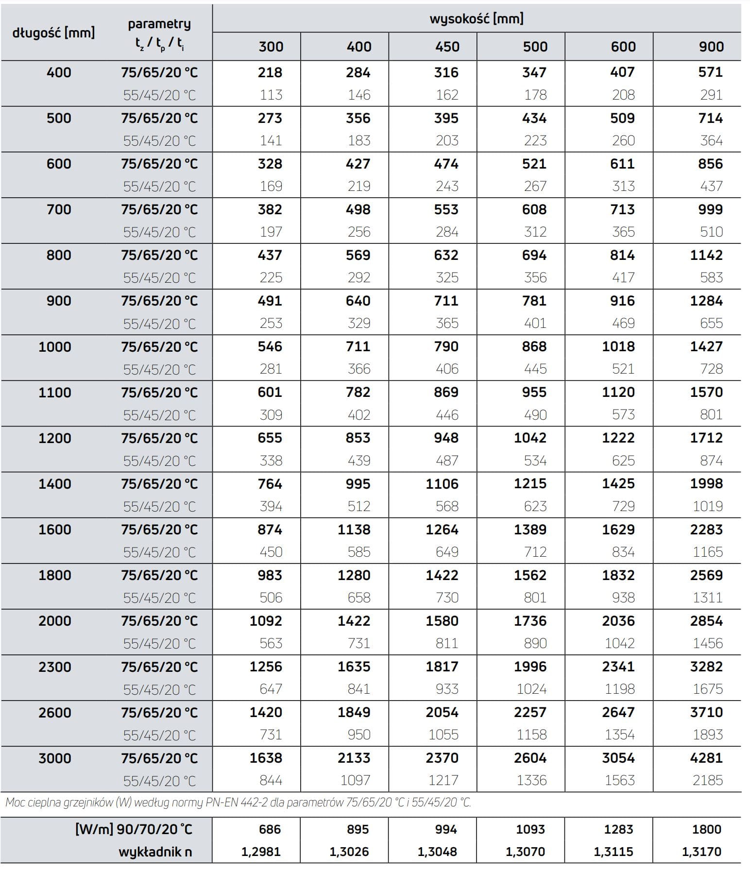 Parametry grzejnika 600x1600 (tz/tp/ti):