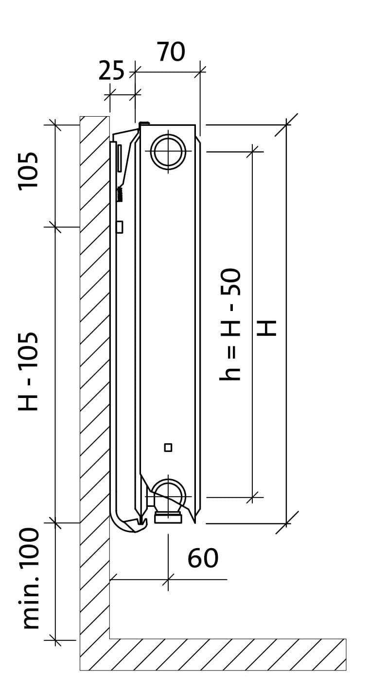 Grzejniki typu CV wyposażone są w cztery boczne i dwa dolne otwory przyłączeniowe z gwintem wewnętrznym ½″.
