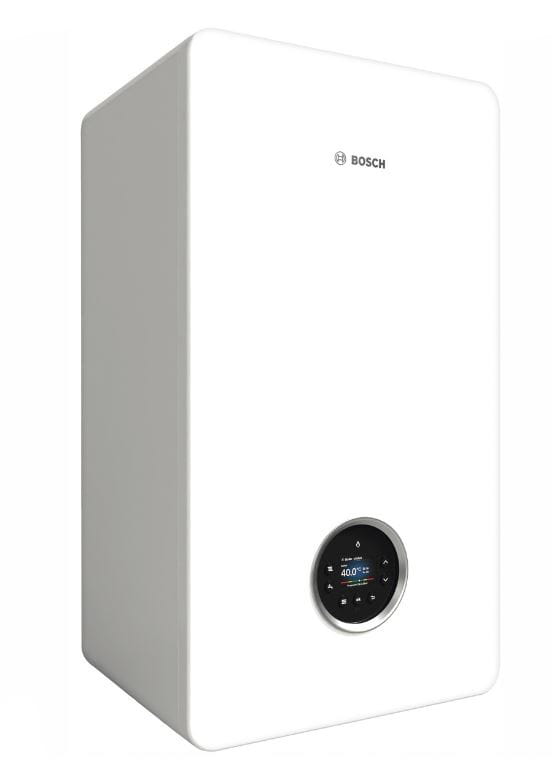 Niewielkich wymiarów jednofunkcyjny kocioł kondensacyjny BOSCH Condens o mocy 35 kW. Wymiennik wykonany z nierdzewnego stopu aluminiowo-krzemowego. Front biały.