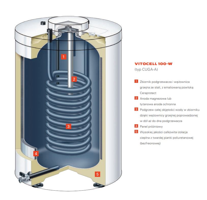 - Podgrzew całej objętości wody w zbiorniku dzięki wężownicy grzejnej poprowadzonej w dół aż do dna podgrzewacza