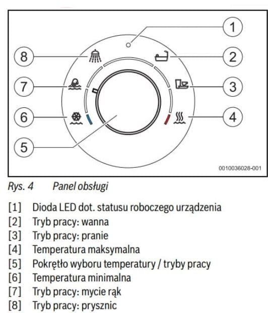 Panel obsługi z wygodnym pokrętłem nastawczym opatrzonym oznaczonym czytelnymi symbolami umożliwia ustawienie wielu parametrów, m.in. temperatury wody czy też wybór jednego z 4 możliwych trybów w zakresie od 20°C do 60°C: mycie rąk, prysznic, kąpiel i zmywanie, do których przypisane są różne wartości zadanej temperatury. Zabezpieczenie przed ingerencją dzieci (aktywowane opcjonalnie przez instalatora) chroni przed przypadkowym podniesieniem temperatury i poparzeniami. Dzięki elektronicznemu wykrywaniu pęcherzyków powietrza podgrzewacz c.w.u. odpowietrza się automatycznie. Wszystkie funkcje bezpieczeństwa zostały przetestowane przez niezależną instytucję VDE.