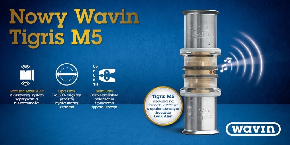 Wavin Tigris M5 został oparty na niezawodnych i cenionych cechach swojego poprzednika Tigris K1/M1. Zaprojektowany z myślą o potrzebach instalatora, Wavin Tigris M5 jest pierwszą na świecie kształtką, która posiada innowacyjną funkcję ACOUSTIC LEAK ALERT (akustyczne wykrywanie nieszczelności).