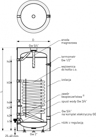 - Za utrzymanie stabilnej temperatury wody i wydajne działanie wymiennika odpowiada wężownica spiralna o zwiększonej powierzchni. Zlokalizowana w dolnej części zbiornika najefektywniej ogrzewa wodę użytkową. Zastosowanie wydajnej izolacji z gęstej pianki poliuretanowej lub polistyrenowej gwarantuje niewielkie straty ciepła.
