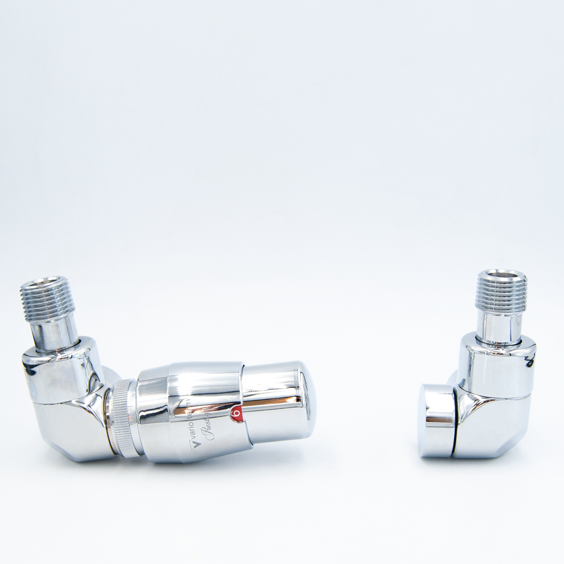 W komplecie (jak na zdjęciu): zawór termostatyczny osiowy, zawór odcinający osiowy, głowica termostatyczna GS.02-02C